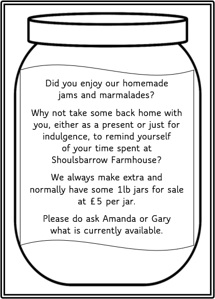 If you would like a cooked breakfast, we can offer sausages, bacon, egg, mushrooms, tomato and baked beans; we call this our Shoulsbry breakfast and of course you can choose any combination of these. The sausages and bacon come from our own Gloucestershire Old Spots pigs reared here on our farm and the eggs are from our chickens and ducks. There is always brown or white toast; the bread is homemade by Gary.